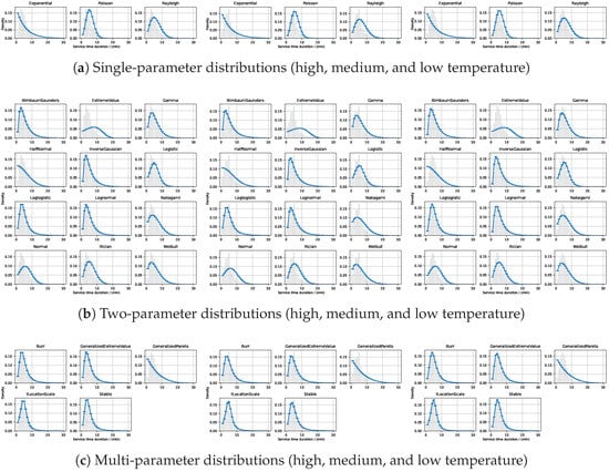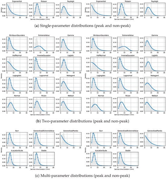 Figure 3 provides a comprehensive visualization of the fitting results for single-parameter, two-parameter, and multi-parameter PDs applied to PWT service duration data during peak and non-peak periods. Specifically, Figure 3a shows the fitting curves and error bars for single-parameter PDs, Figure 3b presents the fitting results for two-parameter distributions, and Figure 3c illustrates the fitting outcomes for multi-parameter distributions. Through this figure, we can qualitatively assess the relationship between the fitted PD curves and the original data distribution.