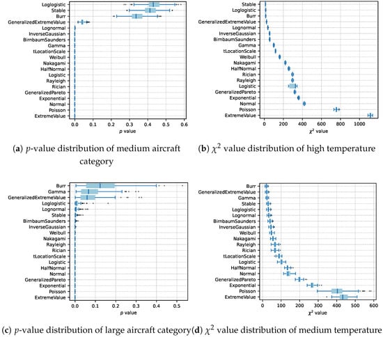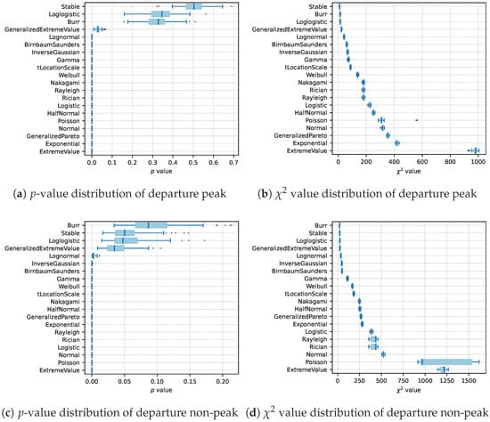 Additionally, to assess robustness, 100 randomized experiments were performed, each fitting distributions to 80% randomly sampled data from the original dataset. The results of the chi-square tests quantitatively evaluating the fitting performance are presented in Figure 4, offering detailed statistical insights into the goodness-of-fit assessments.