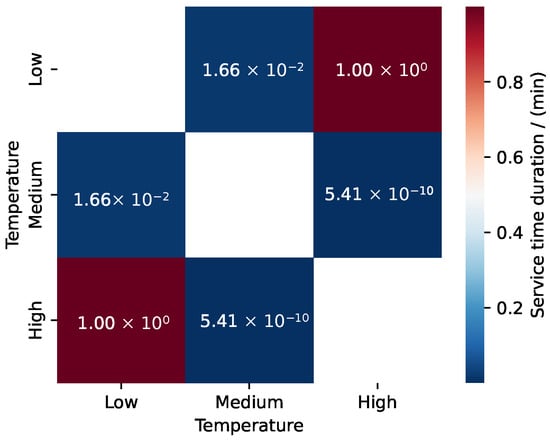 Chi-square test results: Heatmap of p-values for comparing PWT service durations between different temperature categories (high, medium, and low temperatures). The focus is on the pairwise comparisons among these temperature categories.
