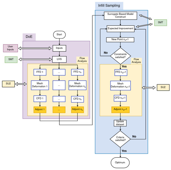 A framework intended for aerodynamic shape optimization must incorporate the following essential components: computational fluid dynamics (CFD), geometric parametrization, mesh deformation, design of experiments (DoE), sampling, and optimization. The following open-source codes are utilized here to address these components: SU2 (Stanford University Unstructured) and the Surrogate Modeling Toolbox (SMT).