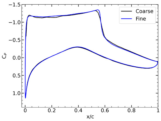 Pressure coefficient distributions of the coarse (black line) and fine (blue line) mesh levels.