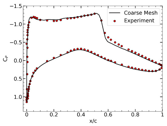 By evaluating the overall values, it is observed that the differences among the three mesh levels are negligible when considering the associated computational costs. The pressure coefficient distributions around the airfoil for the coarse, medium, and fine mesh levels are examined, the coarse and medium mesh levels resemble each other. The coarse and fine mesh levels are plotted in Figure 3, demonstrating very close agreement between the two.