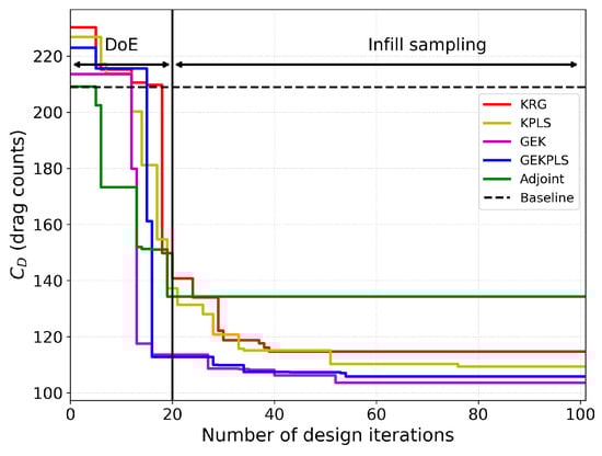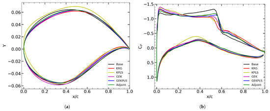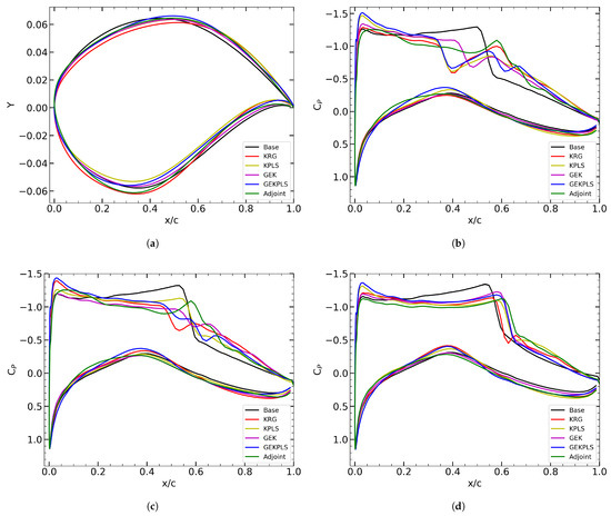 Multi-point optimization studies were conducted by considering the problem defined in Equations (16)–(18). Among the investigated methods, the GEKPLS method achieved the highest overall drag reduction with an improvement of 43.92%, closely followed by KPLS (42.80%) and GEK (41.58%). The KRG method also showed a comparable performance with a 41.27% improvement. In contrast, the adjoint-based approach achieved a 34.84% drag reduction, indicating the superior performance of the surrogate-based methods for this case.