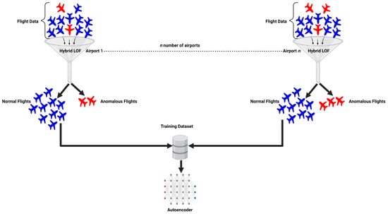 Furthermore, unsupervised anomaly detection techniques can be divided into traditional machine learning methods like clustering or modern deep learning techniques such as Recurrent Neural Networks (RNNs) that employ multiple layers of neurons. The identification of anomalies in flight data through traditional ML depends on factors including the destination airport and the number of flights being examined. When these factors are taken into account, they introduce a considerable amount of variability in the analysis results. Modifying any of these factors results in a corresponding change in the outcomes. Therefore, a more comprehensive approach is pursued through the application of deep learning methodologies. By utilizing deep neural networks, a data-oriented model can be developed to generalize the anomaly detection process in flight data. This model is established through training on normal flight occurrences drawn from historical flight records. For deep learning techniques to preserve the model’s accuracy, it is essential to label the data so that the model is exclusively trained on normal flights. This paper employs previously validated hybrid-Local Outlier Factor (LOF) technique [2] to label normal and anomalous flights, with the normal flights being utilized to train various DL models. Figure 1 depicts the categorization of flight data as either normal or anomalous flights using hybrid-LOF. The deep learning model is trained using a dataset composed of normal flight records.
