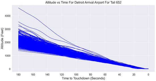 The dataset, which was preserved in MAT files (a binary file format used by MATLAB), underwent a procedural transformation to be represented in the structure of Structured Query Language (SQL) tables. This conversion enabled the effective retrieval and application of the data. For each distinct flight, a collection of 132 flight parameters, considered imperative by industry experts, were evaluated. The intentional exclusion of dynamic weather-related parameters guarantees that all flights are subjected to a uniform analysis related to aircraft behavior. As such changes in weather do not lead to anomalies. However, any weather-related occurrences, such as variations in wind speed or direction that affect aircraft behavior and the conduct of the flight crew, are considered based on recordings of other flight parameters like Localizer deviation and alterations in Drift angle caused by shifts in wind direction and speed. This has been thoroughly demonstrated in a case study provided in the work [20]. Specific flight parameters that possess constant values, such as the engine number, were also excluded from the analytical process. The values corresponding to all 132 flight indicators were normalized, given that each flight parameter exhibited a unique spectrum of values and measurement units. The dataset underwent a comprehensive review to detect and amend any instances of missing data or corrupt values. The aforementioned flight parameters were sampled at frequencies varying from 1 hertz to 16 hertz. To ensure the alignment of data points, all flight parameters underwent conversion to a uniform sampling frequency of 16 hertz through the interpolation of values obtained from parameters sampled at lower frequencies. For the purposes of analysis, the concluding three minutes of the flight duration, encompassing the approach and landing phase, were selected. The precise coordinates at which each aircraft made contact with the runway were established by considering a range of flight parameters, including the Flight Phase (PH), the presence of Weight on Wheels (WOW), in addition to the Latitude (LAT) and Longitude (LONG) coordinates. The latitude and longitude coordinates were employed to accurately identify the specific runway utilized during landing. Moreover, all flight trajectories were adjusted to correspond to the designated altitude of the airport, thereby eliminating any negative values associated with the altitude flight parameter. As a result, by systematically traversing the flight timeline in a reverse order, it became feasible to synchronize the landing of all aircraft upon the same runway with precision, aligning them in relation to the temporal occurrence of touchdown. Figure 2 presents a plot that elucidates the relationship between the flight parameter of altitude (ALT) and temporal progression, derived from empirical data encompassing 675 flights associated with a singular tail number (652) and arriving at the Detroit airport, subsequent to the execution of all requisite data pre-processing.
