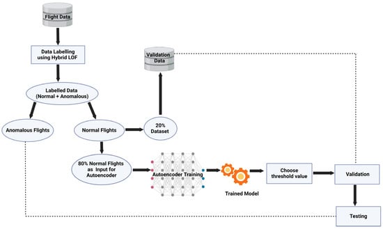 It has been noted that x, the preliminary time series data, undergoes encoding to yield a compact representation z that exhibits a reduced dimensionality compared to x. Following this process, z is subsequently decoded to produce x′, which serves as the reconstructed version of the original input. Both x and x′ are characterized by an equivalent dimensionality and are anticipated to be theoretically indistinguishable. Consequently, an autoencoder is constructed to optimize the training of x and x′ to achieve a state of near equivalence, with the divergence being quantified through reconstruction error. An autoencoder is employed in this paper for the objective of identifying anomalies within a flight data. The architecture of the hidden layers, comprising the encoder and decoder for anomaly detection, is characterized by an hourglass configuration. The encoder is designed with a diminishing number of neurons, facilitating the generation of a compressed, low-dimensional representation of the input, whereas the decoder features an increasing number of neurons to perform the reconstruction process, yielding the output as depicted in Figure 3. The compressed vector representation z of the input and its subsequent reconstruction x’ are integral to the efficacy of this task. Figure 4 summarizes the procedural steps undertaken to train the autoencoder for the detection of anomalies in the flight data.
