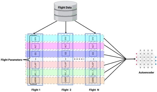 The initial methodology encompasses the sequential input of all normal flights alongside their corresponding flight parameters into the encoding layer of the autoencoder. A single autoencoder is employed, systematically processing data from all standard flights in a sequential manner as demonstrated in Figure 5. In the subsequent methodology, similar flight parameters from all normal flights are pooled together and presented to the autoencoder in a parallel fashion, as illustrated in Figure 6. The third approach involves the concurrent feeding of each flight into its designated autoencoder cell. In this strategy, each normal flight independently trains its respective autoencoder, followed by the aggregation of the mean values derived from these discrete autoencoders for the final evaluation, as depicted in Figure 7.