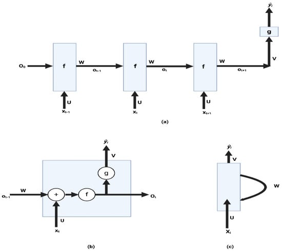 Figure 11a illustrates the expanded structure of Recurrent Neural Networks (RNNs) as they handle data across three sequential time intervals called state or cell. At time step t − 1, the input xt−1 is fed into the activation function f with input weights U, producing the output ot−1, which is then adjusted with output weights represented as W. Subsequently, at time step t, the input xt undergoes the same computational process. A significant aspect to note is that during the processing of input xt, the previous state’s output is considered. Likewise, this process is reiterated for input xt+1 at the third time step. In order to maintain architectural consistency, the initial state or cell incorporates a zero output o0 from the preceding state, given the absence of a previous state. The final output ot+1, accompanied by weight W, traverses through the output layer employing function g and weights V to yield the ultimate output ŷi. This is depicted in Figure 11b, consolidating all the time states or cells, while Figure 11c illustrates the cell with a loop, indicating the recurrent nature of the processing for each element in the input sequence. Therefore, a single layer of neural network is utilized to process newly updated information across different time intervals, rather than employing three separate layers of neural network. This efficient method greatly improves the swift processing of long sequences while maintaining their sequential coherence. Its effectiveness is rooted in its ability to directly understand the relationship between input and output sequences.