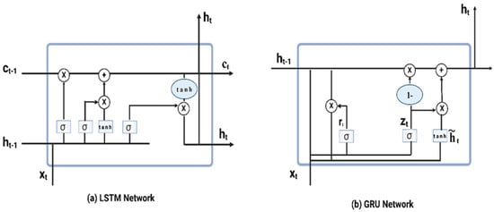 In Figure 12a, it is demonstrated that every LSTM cell is augmented with a distinct state vector and three distinct types of nonlinear gates, specifically the input gate, output gate and forget gate, which serve to control the movement of data into and out of the cell. X = (x1, x2, …, xN) denote the inputs of LSTM cell unit, where xt is the input vector at the time step t. σ is the sigmoid function and dot product (•) is the elementwise multiplication. Then,