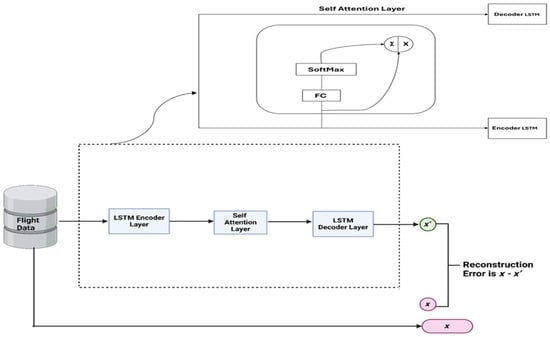 The “memory” of Recurrent Neural Networks (RNNs) exhibits a time-dependent characteristic, presenting both advantages and disadvantages. RNNs demonstrate a tendency to assign greater importance to recent information compared to distant historical data, resembling a weighted moving average. This characteristic proves advantageous in the context of modeling time-series data, where recent information holds more significance. Nonetheless, it also poses drawbacks in two aspects: firstly, older information tends to be disregarded even if it remains relevant and secondly, the weighting of information within a sequence may not always align solely with temporal proximity [24]. The transformer architecture has demonstrated superior efficacy compared to RNNs and convolutional (CNN) networks, especially in the domains of text translation and processing [25], as well as recently in image classification [26]. Models that rely solely on self-attention, derived from the transformer architecture, are demonstrating potential in the realm of time-series classification [27]. Attention mechanisms, initially developed for text prediction, enable the network to focus on specific parts of a sequence non-sequentially, emphasizing the significance of individual tokens in the sequence, thus enhancing the overall representation of the sequence [25]. Attention can be generally described as a weight or “context vector” of importance within a sequence [24,28]. Attention layers have emerged as a powerful tool in neural networks, enabling computers to understand and focus on important information within a sea of data. Their applications have expanded to computer vision and other domains such as time series analysis. The Transformer is a deep learning model that predominantly employs the self-attention mechanism for the purpose of modeling and omits the RNN component. The self-attention mechanism enables the model to allocate varying weights to each position within the time series, allowing it to concentrate on information from different positions during input processing. When the self-attention mechanism is integrated with LSTM architectures, it functions by encompassing all LSTM output in a sequence and establishing a distinct layer to focus on specific parts of the LSTM output more than others [29]. In anomaly detection, the attention mechanism is particularly beneficial, as not all time steps contribute equally to identifying anomalies. Specifically, time steps immediately surrounding an anomaly often contain more valuable information compared to those occurring further away. By incorporating attention, the model can effectively focus on these critical time steps, thereby improving its ability to detect anomalous events. This research implements this LSTM architecture integrated with the self-attention layer in an autoencoder to detect anomalies in flight data. The model architecture is summarised in Figure 14.