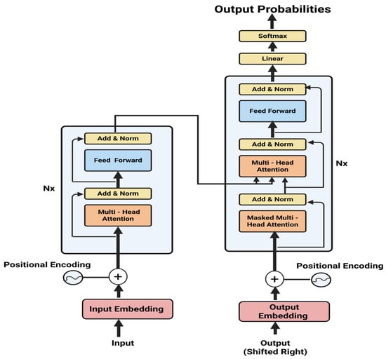 Transformers are deep learning models that also handle sequential data but unlike RNNs they use attention mechanisms to handle dependencies in data without recurrent layers, enabling parallel computation and capturing long-range relationships efficiently. The encoder is used to encode the input sequence while the decoder produces the output sequence [25]. The self-attention mechanism incorporated in this architecture facilitates the efficient transfer of information between the encoder–decoder pair in a bidirectional manner. Additionally, self-attention enhances the encoding of the input sequence performed by the encoder. Figure 15 illustrates a simple transformer architecture. The Transformer decouples sequence modeling from recurrence by relying entirely on attention mechanisms. It consists of an encoder stack (left) and a decoder stack (right), each repeated N times as shown in Figure 15. The following paragraph summarizes the working of Transformer.