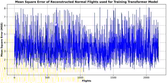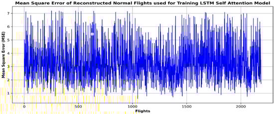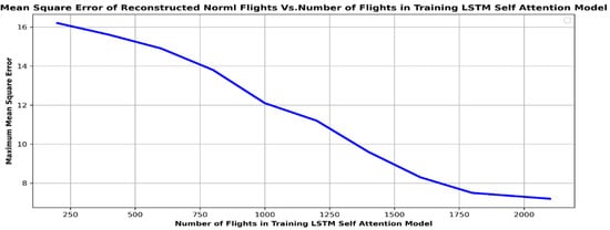 As the number of normal flights employed for model training rises, the mean square error (MSE) diminishes during the normal flights’ reconstruction process. Figure 28 illustrates the relationship between MSE, and the number of normal flights utilized to train the LSTM self-attention model.