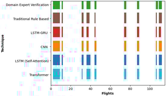 For validation process 25 anomalous flights mixed with 90 normal flights were tested. The study revealed that the model, which was trained with an LSTM self-attention mechanism, accurately identified 24 out of 25 anomalous flights as confirmed by domain expert validation. There was one instance of a false negative. Figure 32 presents a qualitative analysis comparing the deep learning-based approaches with traditional techniques in relation to the ground truth. In Figure 32, flights identified as anomalous by each technique are depicted in distinct colors, while the white areas in between represent flights categorized as normal by the respective technique. The x-axis illustrates the total of 115 flights. Out of 115 flights 25 flights are true anomalies and 90 flights are normal. The y-axis enumerates all the techniques being compared. Verification by domain experts found 25 out of the 115 flights as genuine anomalies. These anomalies are highlighted in green. Secondly, 22 flights, indicated in brown, were accurately classified as anomalous by the traditional method. However, the traditional approach failed to identify 3 anomalous flights that were outside the specified parameters or boundaries outlined in Table 1. Model based on LSTM/GRU detected only 20 anomalies represented in red. All these anomalies were consistent with the ground truth. It failed to recognize 5 legitimate anomalies. Model based on CNN was able to detect 22 anomalies as shown in orange color. Transformer model was able to detect 23 anomalies as shown in cyan color. It missed 2 anomalies. LSTM with self-attention mechanism was able to detect 24 anomalies and it failed to detect 1 anomaly. Therefore, this model was most accurate amongst all DL models.