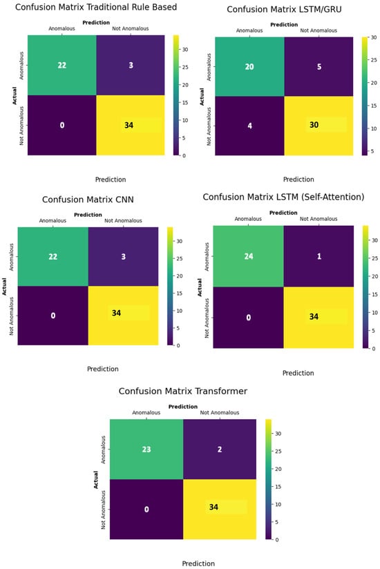 A quantitative analysis using a confusion matrix was performed. A confusion matrix aids in assessing the outcomes of each method against the ground truth. Figure 33 depicts the confusion matrix associated with each technique under investigation. The traditional rule-based method successfully identifies 22 true anomalies, known as true positives, while it fails to recognize 3 instances of anomalous flights, as illustrated in the confusion matrix. These instances are classified as false negatives. Nevertheless, it accurately detects 34 occurrences of normal flights (false positives) taken from the pool of 90 normal flights. As a result, it attains a Precision Rate (PR) of 1 and a Recall Rate (RR) of 0.88. The traditional method attains an F-1 score of 0.94. This same procedure was conducted for all DL based methods and the results are presented in Table 7.