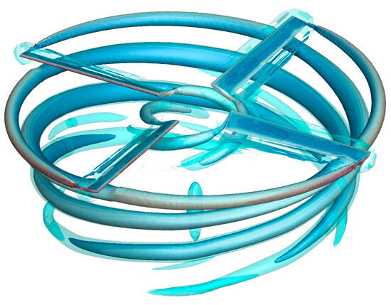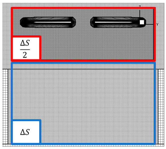 After constructing the near-body grid system, a series of Cartesian multiblock off-body grids were automatically generated using OVERFLOW. A zoomed-in view of the combined near-body and off-body grid system is shown in Figure 2. In this figure, DeltaS is defined as 20% of the chord length at the 75% radial location of the rotor blade (i.e., DeltaS = 0.20 c75). The rotor near-body grids can be observed at the top of the image, exhibiting an approximate cell aspect ratio of 1:1 at the overset boundary between the rotor grids and the Cartesian background grids. Off-body grid generation employed two refinement regions. The first region used a grid refinement of ΔS/2 and extended 0.2R radially beyond the blade tip, 0.35R above the rotor, and 0.65R below the rotor. The second refinement region used a grid refinement of DeltaS and extended 2R below the rotor. The far field then extends 20 rotor radii from the rotor’s hub, while progressively doubling off-body cell lengths. For the far field, characteristic outflow based on Riemann invariants with freestream imposed on the incoming characteristics was used. In total, 10 million nodes were used to model the off-body grids. For turbulence modeling, the Spalart–Allmaras single-equation turbulence model with rotation corrections was used. In this study, the Euler terms were discretized using central differencing, with sixth-order accuracy applied in the off-body regions and third-order accuracy used in the near-body regions. To save computational cost, rotational source terms were used rather than rotating the overset rotor system.