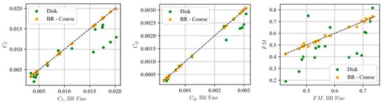 Plots comparing the accuracy of the OVERFLOW output at both fidelity levels to the highest resolution BR cases are included in Figure 6. As described earlier, the BR Coarse and Fine models gave almost indistinguishable results for both thrust and torque coefficients. Slight discrepancies can be discerned when observing the FM comparisons. Larger discrepancies are observed when comparing the disk model simulations to the BR Fine data, however. The disk model is found to underpredict both thrust and torque coefficients at their higher values. The discrepancies are again amplified when viewing the FM comparison plot. These comparisons are only reported for a small subset of the data where all three simulation models had been run for identical cases, namely, the first 20 samples in the case list since only 20 BR Fine cases were run.