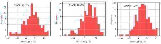 To better quantify the discrepancies between the two fidelity levels, histograms of the delta between blade-resolved (high-fidelity) and actuator disk simulations (low-fidelity) were created, as shown in Figure 7. The plots show that the thrust coefficient, torque coefficient, and FM are all under-predicted with the disk model. The mean absolute percentage error (MAPE) is also reported for each metric, with both the thrust coefficient and FM having MAPE around 18.2% and the torque MAPE standing at approximately 11.6%. This result appears well suited for MFM if the model can learn to correct the observed bias of the disk vs. BR simulations.
