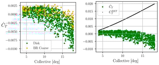 Solving for gives thrust coefficient as predicted by BET, denoted here by . The new, augmented target is the delta between simulated thrust in CFD and the blade element predictions and is plotted against the collective in Figure 9 for both actuator disk and BR simulations. The augmented target, which is the difference between the CFD and analytic BET thrust coefficients, is observed to increase with an increasing collective. This is because the BET approach assumes a constant lift curve slope and does not include any stall-related effects at a high rotor collective and thrust coefficient.