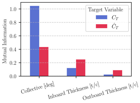 The MIs for the augmented thrust target are contrasted against the raw thrust results in Figure 10 for the three features with the largest mutual dependence, showing the successful disentanglement through the decrease in collective and increase in the airfoil thickness dependencies, respectively. This results in a dataset more likely to produce a high-performing surrogate model.