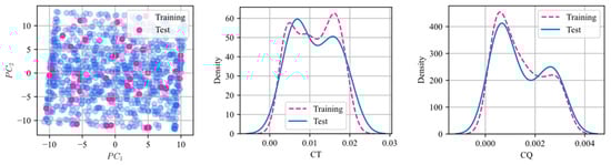 Training vs. Test Data Principal Components 1–2 (Left). Thrust and Torque Coefficient KDE’s (Middle, Right).