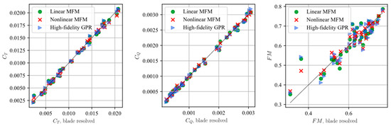 Surrogate models were first generated for the high-fidelity dataset alone to create a baseline for comparison with the MFM models. All the training data were standardized through pre-processing. Unless stated otherwise, a Radial Basis Function kernel was adopted, and kernel hyperparameters were determined by maximizing the marginal log-likelihood of the simulated outputs given the inputs. A GPR model was implemented and is referred to as “High-fidelity GPR” for the remainder of the paper. Both the linear and non-linear co-kriging approaches were used to compare with the baseline, using all the available high- and low-fidelity data. These are referred to as “Linear MFM” and “Non-linear MFM” for the rest of the discussion. The parity plots in Figure 12 show the predictive accuracy of the three surrogate model implementations to predict the held-out high-fidelity BR data. In addition to showing good predictive capability with the surrogates, these figures give an indication that the differences in the approaches are not very large when including all high-fidelity data. This observation highlights the capabilities of ordinary GPR models when sufficiently large training data sets are available. The results for MAPE in Table 4, however, clearly indicate that the Non-linear MFM has the best predictive accuracy on the held-out test data across the target coefficients. For linear autoregressive models, erroneous trends in the low-fidelity dataset (the actuator disk simulations) will usually involve the high-fidelity data dominating the predictions and may explain the similar prediction accuracy to the High-fidelity GPR. Modeling a non-linear correlation between fidelities can protect against this to a greater extent while still extracting useful trends, implying greater data efficiency and final generalizability, as indicated in Table 4. Following the approach for target engineering the thrust by subtracting the analytical BET, the accuracy on the test set is increased by 0.5% on average across the board, which for the thrust gives a final 2.51% mean absolute percentage error using the non-linear MFM.