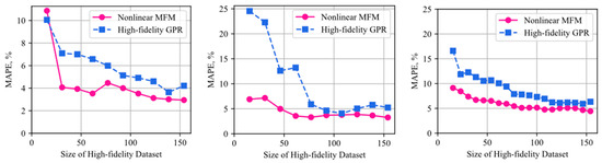 where a GP prior is also assigned to . The choice of kernel for is a composite kernel, as detailed in Ref. [32]. For tractability, Equations (1) and (2) can be decoupled by substituting the prior distribution with the posterior predictive , meaning that the GPRs can be sequentially solved for instead of sampling from the much more complex joint posterior distribution. To quantify potential improvements in accuracy and reductions in cost achieved with MFM, the results are compared to ordinary GPRs derived exclusively from high-fidelity data.