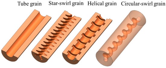 The swirl strength of the gas flowing through the swirl injector decreases gradually along the length of the motor due to the gas viscosity and rough burning surface. In addition, the combination of a fuel grain port configuration and the swirl injector may effectively regulate the gas flow line and improve the gas swirl strength in the whole combustion chamber. Therefore, three fuel grains with different swirl effects were considered in this study and compared to a single port fuel tube grain using numerical calculations. The different fuel grain configurations considered in this work are shown in Figure 2.