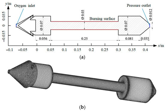 The non-premixed combustion of C4H6 and C2H4 with oxygen was modeled by using the Eddy dissipation (ED) model, coupled to the chemical equilibrium. The enhanced wall treatment was employed as a turbulence boundary condition on the burning surface. Three-dimensional unstructured grids were used in the calculation due to the non-axial symmetry of the injector and the fuel grains. The physical model and boundary of the combination of the swirl injector and tube grain are shown in Figure 3a. The methodology employed in this study has been rigorously validated against published literature, demonstrating an acceptable level of deviation in comparative analyses [].