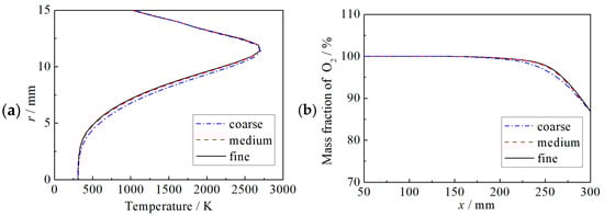 Figure 4 shows that both the radial profiles of temperature and the axial profiles of O2 mass fraction were presented as monotonic convergence, and grid-independent solutions were obtained when the grid had 164,096 cells, with variations between the medium and fine mesh of less than 1%. Additionally, Figure 5 indicates that the numerical error reduced roughly following the spatial order of accuracy of the scheme. Therefore, the size of the grid with 164,096 cells is considered acceptable for the cases.