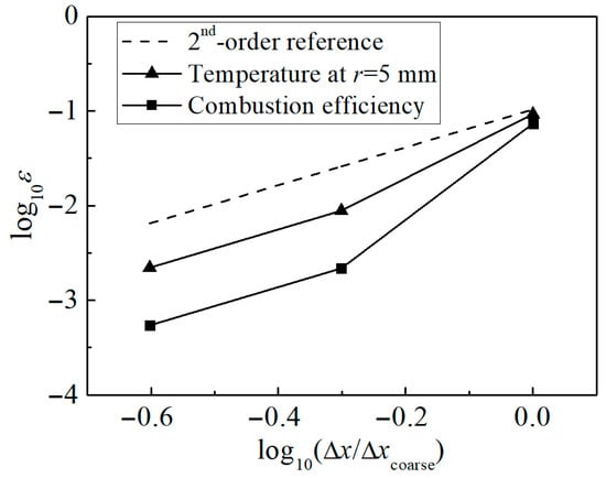 where γ represents the common variable. The numerical errors of temperature and combustion efficiency are shown in Figure 5.