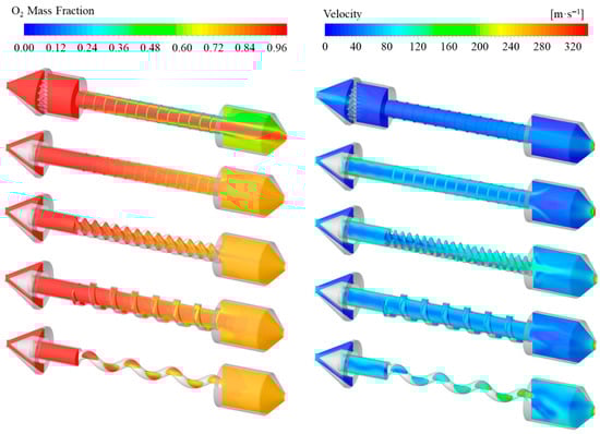 The effective mixing of the gasified fuels and the oxidizer is very important for the large-scale diffusion combustion of HRMs, which could be associated with the flow velocity. The oxygen mass fraction and the flow velocity information of the non-reactive flow for various grain configurations are shown in Figure 6.