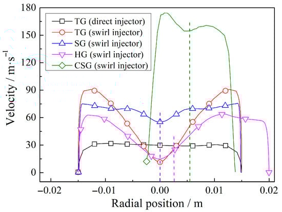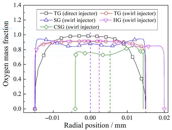 The mixing effect could be evaluated through the radial distribution of oxygen at the tail end of fuel grains, which is shown in Figure 7. The abbreviations used in the figure legend are as follows: TG, tube grain; SG, star-swirl grain; HG, helical grain; CSG, circular-swirl grain. The dotted lines represent the symmetry axis at the ports’ exit planes.