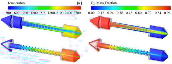Both chemical reaction and diffusion processes are important constituent elements in the combustion of HRMs. In this regard, Figure 9 shows the temperature and the oxygen mass fraction distribution for the star-swirl grain combined with the swirl injector, taking the chemical reactions into account. The results for the tube grain combined with the direct injector were used for comparison with this scenario.