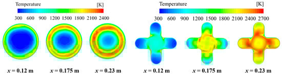 It can be seen from Figure 9 that the oxygen was continuously consumed along the flow direction, and there was still a certain amount of unconsumed oxygen even at the nozzle throat in the case of the tube grain combined with the direct injector, resulting in poor combustion performance of the motor. On the other hand, an intense swirling flow could be formed and maintained in the case of the star-swirl grain combined with the swirl injector. Then, almost all the oxygen was consumed with the temperature rising to 2700 K in the aft mixing chamber. In addition, the temperature distribution in various axial positions of fuel grain ports is shown in Figure 10.