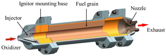 The regression rate of solid fuels can be evaluated only by the HRM ground test, and the facility used in this study was inspired by the setup presented by Liu et al. in a previous study []. The structure of the thrust chamber is presented in Figure 11.
