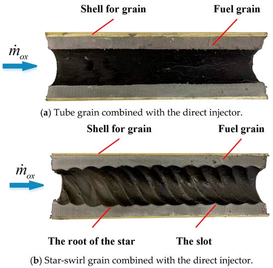 The regression rate of polymer fuels is controlled mainly by the heat transfer to the fuel surface due to the gasification mass transfer mechanism. The tangential velocity component of swirling flow could increase the turbulence intensity, facilitating the mixing and combustion of the gasified fuel and oxidizer. At the same time, the centrifugal force caused by the swirling motion of the oxidizer flow made the oxidizer closer to the combustion surface, compressing the boundary layer and thus bringing the flame closer to the combustion surface []. Therefore, the swirling flow in the fuel grain port could increase the regression rate significantly through heat transfer enhancement []. The swirling injector is the most common method for swirling flow formation. Yuasa et al. conducted experiments by installing a swirling injector at the front of the fuel grain and found that the PMMA combustion rate using the swirling injector was 2.7 times faster than axial injection under the same conditions []. Summers et al. investigated the effect of the parameters of the swirling injector on the regression rate of the grain, and the results showed that a larger angle degree had a more obvious effect on the regression rate. Additionally, a larger swirl number resulted in a more uniform regression rate along the axial combustion surface []. The swirling injector is the most common method for swirling flow formation, but the swirling intensity decreases along the flow path due to the viscosity force and wall friction [].