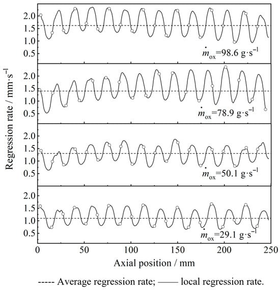 In this study, nitrous oxide was used as the oxidizer. As it possesses a low oxygen content, the motor has a high oxygen-to-fuel ratio, which means that the fuel has minimal impact on the oxidizer mass flux. Additionally, uneven regression rates occurred throughout the combustion process due to the addition of axial mass, but the effect was not particularly noticeable in our experimental observations. The empirical Formula (10) maintains applicability under widely varying flow conditions and thus remains valid for the present investigation. The spatially averaged regression rates of various operating conditions are shown in Figure 14.