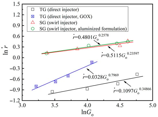 Spatially averaged regression rates of various operating conditions, the TG (direct injector, GOX) data were obtained from Liu et al. [].