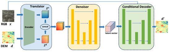 The LD-DEM algorithm comprises three modules: translator, denoiser, and conditional decoder, as depicted in Figure 1. The translator module includes two encoders designed to encode RGB images and DEM images into latent vectors, thereby conserving computational resources for subsequent processes. The denoiser is responsible for feature extraction in the latent space and generating latent vectors for the DEM, which means that during the training of the diffusion model, the latent vector is used as a condition to enable the diffusion model to learn the conditional distribution . The conditional decoder module decodes the latent vectors while integrating information from RGB satellite images to produce the DEM results in the pixel space, denoted as .