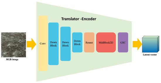 The primary function of the translator is to extract features from the input RGB images and DEM data and transform them into the latent space. We employ the structure of a variational autoencoder (VAE) model. The network architecture is illustrated in Figure 2 and consists of three DownBlock submodules, one ResBlock submodule, one MidBlock submodule, and one GSC submodule.