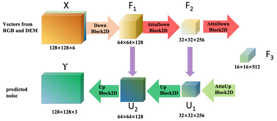 The denoiser module generates latent vectors for the Digital Elevation Model (DEM) using a UNet architecture, as depicted in Figure 3. This UNet employs a symmetric encoder–decoder structure to process a 6-channel input, combining three channels from the RGB image and three from the DEM, represented as , where H and W denote the initial height and width of the feature map.