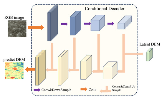 As shown in Figure 4, the structure of the conditional decoder draws inspiration from the U-Net architecture. Its inputs include the DEM latent vector generated by the denoiser module and the RGB satellite image. The generation process of the conditional decoder is divided into two main steps: downsampling of the RGB image and upsampling of the DEM latent vector.