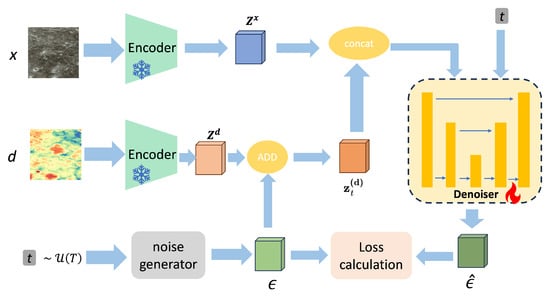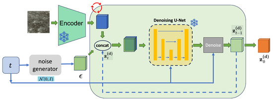 where denotes the expectation, represents an image sampled from the training dataset, and can be directly computed using Equation (4). These operations are performed in the pixel space, which is computationally expensive. Latent diffusion [38] addresses this issue by applying the Denoising Diffusion Probabilistic Model in a lower-dimensional latent space, thereby significantly improving the training and sampling efficiency of the diffusion model without compromising its quality. During the model training phase, latent diffusion first encodes the input image into a latent vector using an encoder . Subsequently, the diffusion model is trained in the latent space. In the inference phase, random Gaussian noise is sampled in the latent space as the input to the diffusion model. After multiple iterations of denoising, the generated latent vector is obtained. Finally, the latent vector is decoded back to the pixel space using a decoder D, resulting in the reconstructed image .