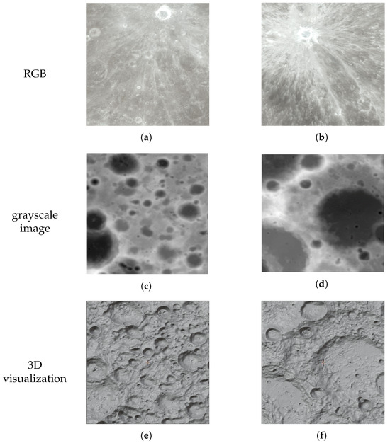 (a) RGB data of the lunar surface and (b) DEM data of the lunar surface; (c,d) are the RGB data and DEM data of the Mars, respectively.