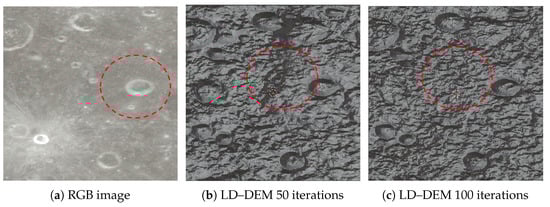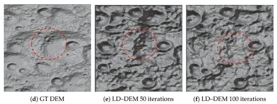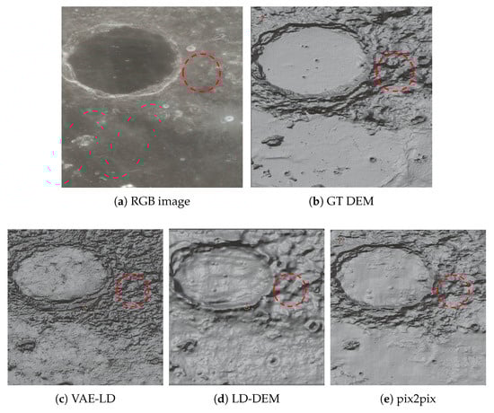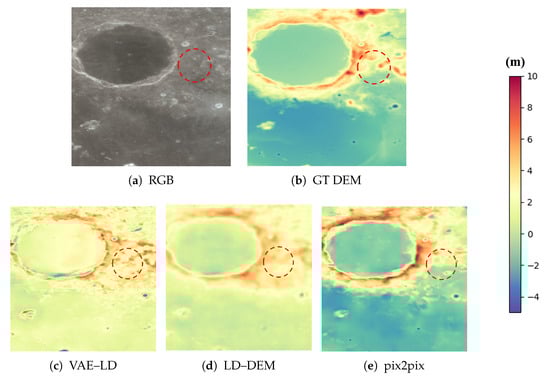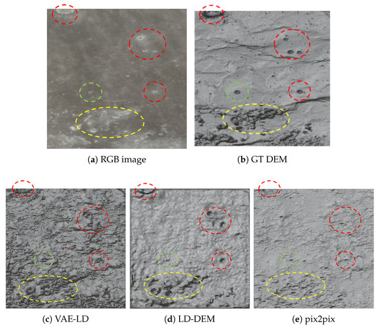 As shown in Figure 9, we first visualized the DEM prediction results for the lunar RGB satellite images with small features from the test dataset. It can be observed that the small features marked by red circles are well detected and generated by LD–DEM. However, for the terrain marked by green circles, none of the three algorithms were able to effectively reconstruct it. For the large-scale complex terrain marked by yellow circles, LD-DEM performed better than the other models in terms of terrain reconstruction, while the results of VAE-LD still contained considerable noise.