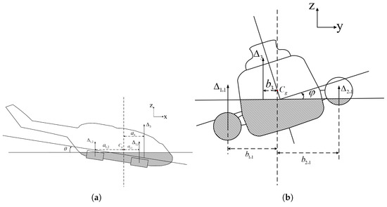where denotes the drainage volume of the helicopter or each airbag, a and b represent, respectively, the displacement between the centroid of each drainage volume and the mass center of the helicopter. As shown in Figure 1, is the mass center of the helicopter, is the trim angle that satisfies Equation (6), is the heel angle, the subscripts mean different parts, where ‘3’ refers to the helicopter, ‘’ refers to the right airbag in Figure 1a and the left in Figure 1b, and so on; ‘’ to ‘’ are the other airbags.