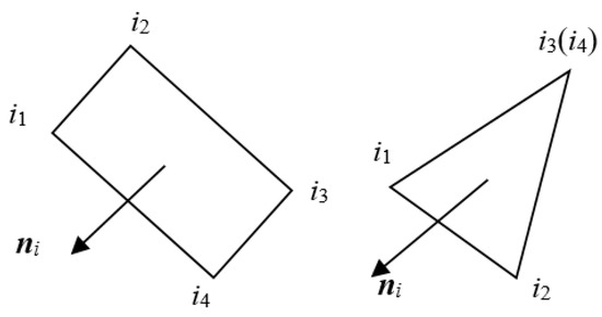 The node number definition and normal direction on these elements are depicted in Figure 2. Let the helicopter and airbag unit node numbers be defined as to ; the normal direction of the element, , is perpendicular to the surface of the element, and the direction satisfies the right-hand helix rule from to . The surface pressure of this element can be written as follows: