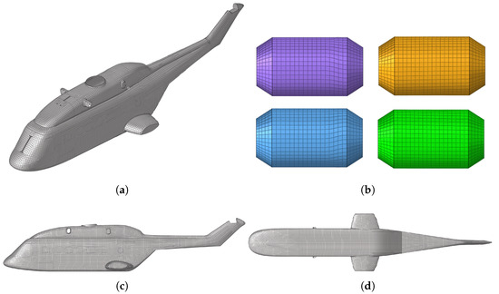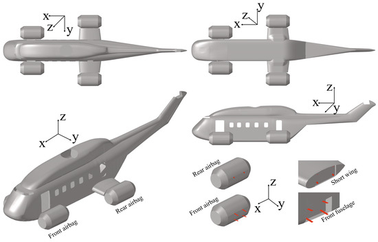 This section first presents the models and detailed parameters of the helicopter, airbags, and connecting straps utilized in this study. Next, the calculation process and implementation of the drainage volume method are briefly described. Finally, the mesh division, material properties, and calculation settings for the helicopter, airbags, and connecting straps under the gradient pressure method are introduced.