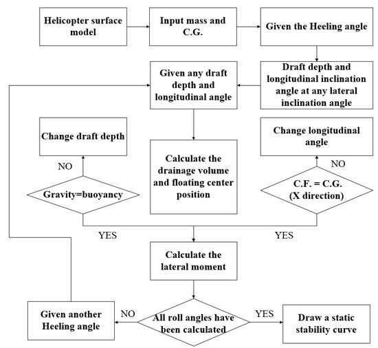 Solving for lateral static stability requires the helicopter’s buoyancy and gravity to be equal at a given lateral angle, and the longitudinal moment to be zero [31]. Therefore, as shown in Figure 4, the calculation process using the drainage volume method is as follows: First, the helicopter surface model is rotated to a specified lateral angle. Next, the waterline height and current longitudinal angle are defined. Then, the helicopter model is intersected with the waterline surface, constructing a closed surface representing the submerged portion. Finally, the submerged volume and centroid position are determined through surface area analysis. In this study, the helicopter model is imported into CATIA software and controlled using Visual Basic (VB). CATIA’s volume and centroid calculation module is then utilized to determine the immersed volume and centroid position. Therefore, throughout the solution process, the helicopter reaches equilibrium at the lateral angle [32].