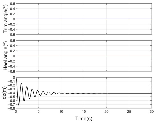 A rigid body model is adopted for the ship, with a total weight of 5000 kg. The gravitational force corresponds to one-third of the fully submerged buoyant force. The center of mass is located at the centroid of the hull, and the initial condition assumes the bottom of the hull is level with the water surface. Figure 7 presents the simulation results of the hull in a freely floating state, obtained using the gradient pressure method. As shown, once equilibrium is reached, both the roll and pitch angles are zero, and the vertical distance from the center of mass to the water surface is 0.414 m, which agrees with the theoretical value of m.